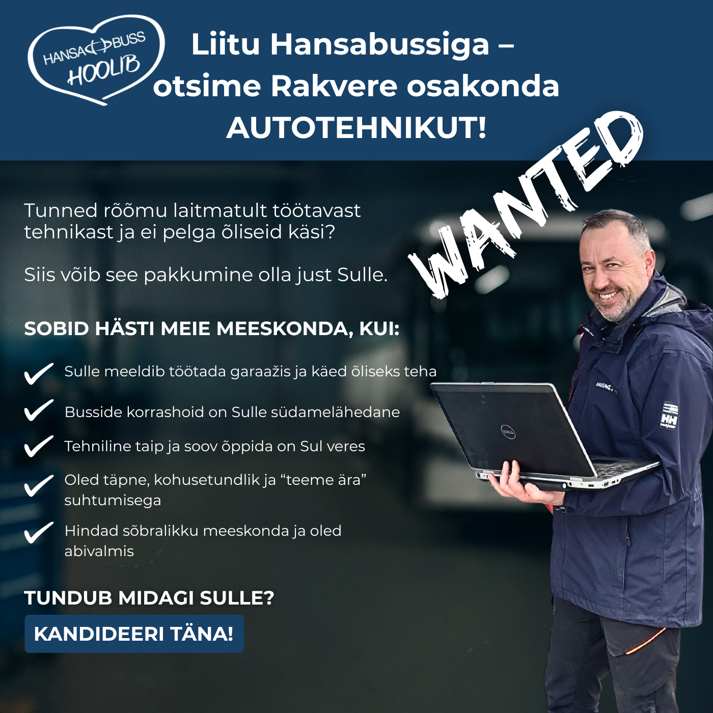 Hansabussis ootab Sind ühtehoidev meeskond. Hoolime oma inimestest ja nende tervisest. Pingutame selle nimel, et luua töökeskkond, kus igaüks tunneks ennast hästi ja hoitult. Oleme pika ajalooga usaldusväärne tööandja. Täidame oma lubadusi ja kohtleme kõiki sõbralikult ning austavalt.